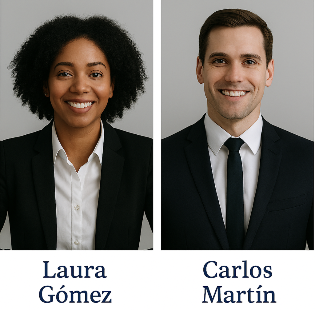 Carlos Martín – Abogado con porte elegante y mirada segura, transmite profesionalismo y cercanía